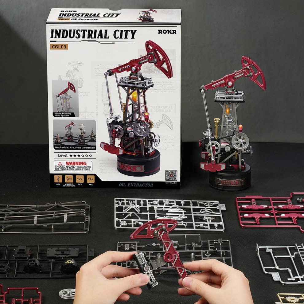 The Industrial City- Oil Extractor  statuesque Oil Pump Jack rhythmically moves with its powerful gears, pulleys, and pistons. Build this 3D puzzle kit from ROKR and complete your Industrial City collection!