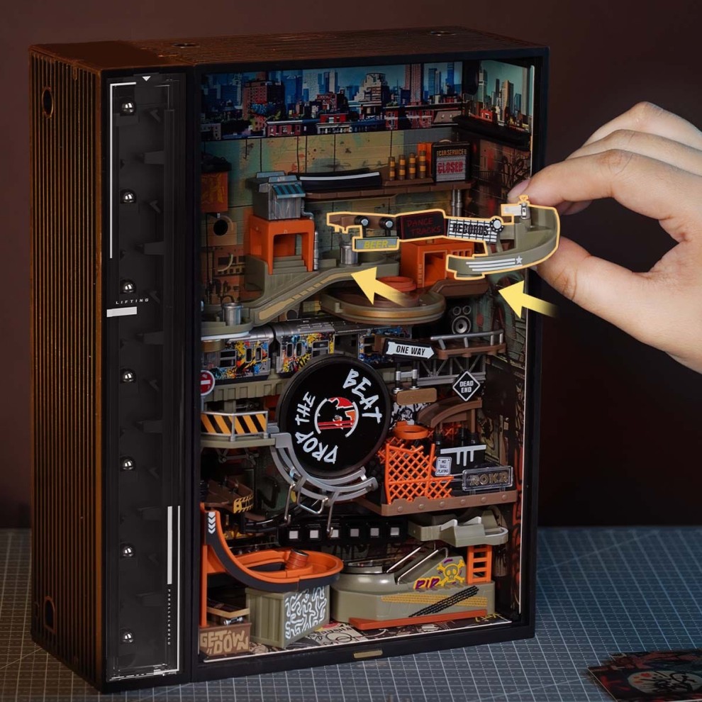 Hip-Hop Street marble run will make you reminisce about those days with your posse when breakdancing, sneakers, colorful graffiti, and hard-hitting beats were all the hype. This marble run is stylized to reflect street life, complete with a spinning record and gold chain. Providing entertainment is a dilapidated train car turned art gallery, a 3x3 basketball court, and a neon-lit skating park.It's not just about style and swag, be pleasantly surprised by the six internal light boxes that react to ambient sounds, creating flashing effects even after the metal marbles have stopped rolling. With over a hundred randomized lighting sequences, it's as entertaining and eye-popping as a beatbox battle!