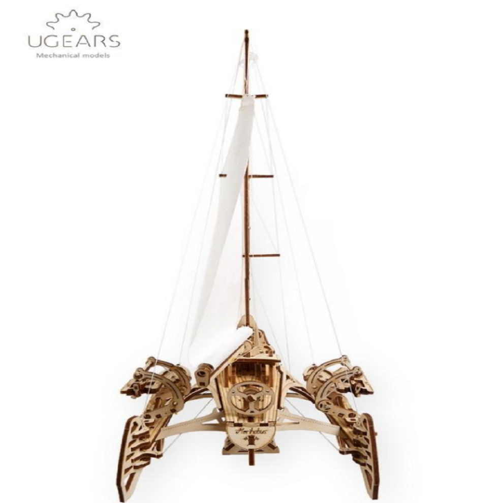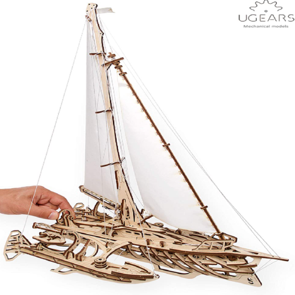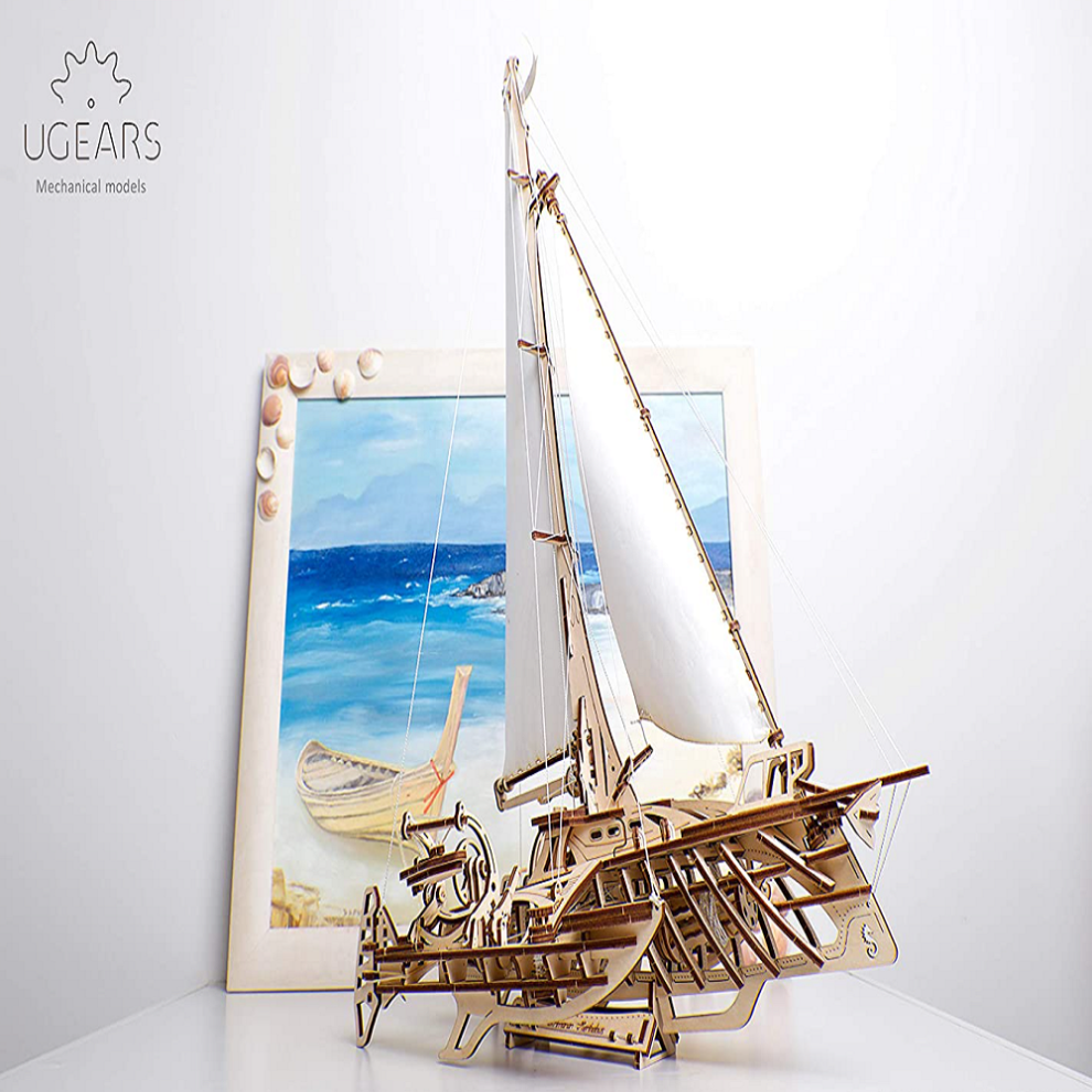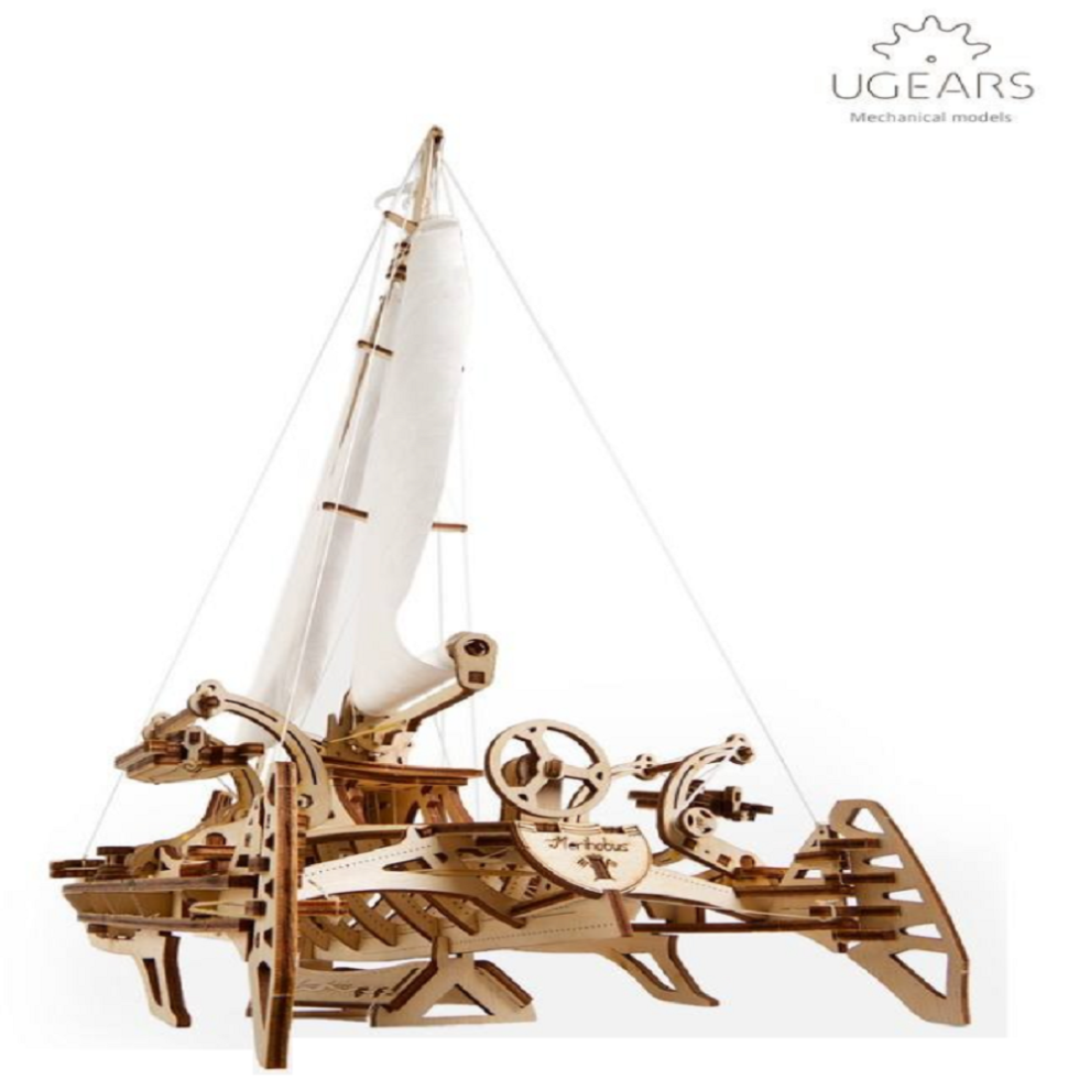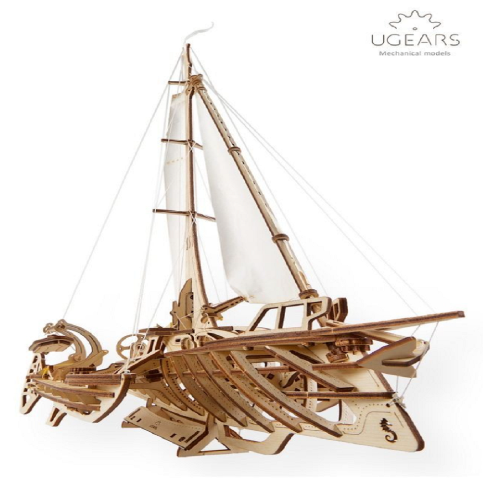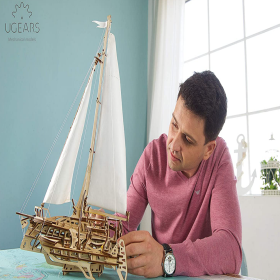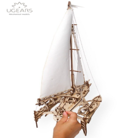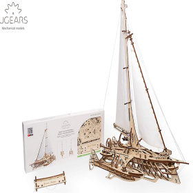 The body of the sailboat is made in the “skeleton” style to ensure good visibility of the mechanism and the design of the sailboat, including such details as bulkheads, frames and beams. The building kit contains many revolving and rotating parts, some of which are used to rise up and lower down the sails and some are used to rotate the boat rudder. Also, it is possible to come to an anchor and rise/lower the life save boats on both sides. Also, thanks to such design, the trimaran is easier than many other boats and faster on the water. Its speed under the sail is high, as well as its maneuverability. That’s why people even have invented trimaran marine races. The sails’ material can be painted by you in either color (the instruction provides several ideas of coloring the sails to add individuality to your trimaran).