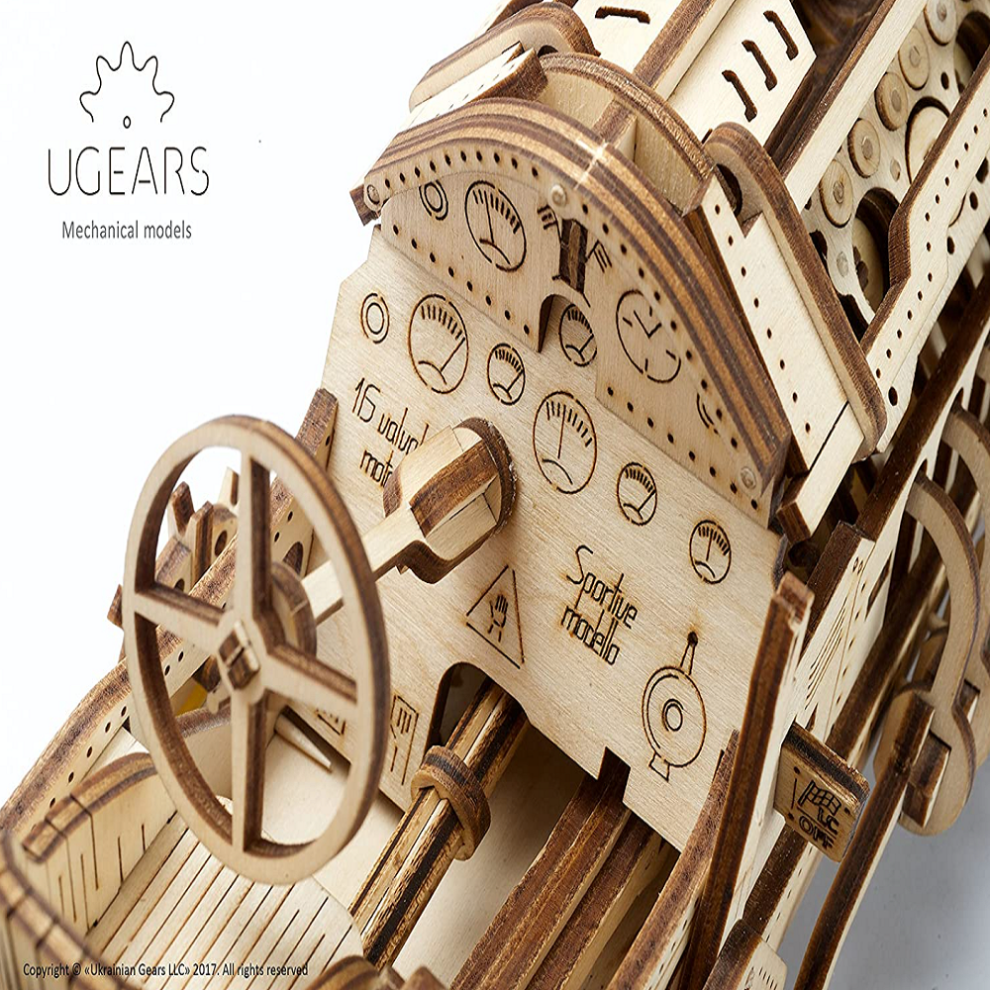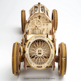 UGears U-9 Grand Prix Race Car features a fully functioning 16-valve V8 engine, link rod and transmission that switches the modes from idle to reverse and to forward. It has a spring-suspended fork and wheels with rubberized genuine sports tires that ensure a rapid acceleration, yet smooth ride. Like all UGears vehicles models U-9 is set in motion by a rubber-band wind up motor. Simply crank up a handle located in the front of the model and watch it race a distance up to 10 meters.