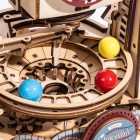 ROKR Chocolate Factory LGA02 has changed the previous style. We use the retro robot factory as its shape. The cute dessert house is created with retro color, which is exquisite in form. We have provided you with more exciting ways of playing. It combines a vertical ascending channel, roulette transmission structure, and double descending track. The push-pull lift mechanism at the bottom of the outer wall can drive the ‘candy’ to run in the factory.