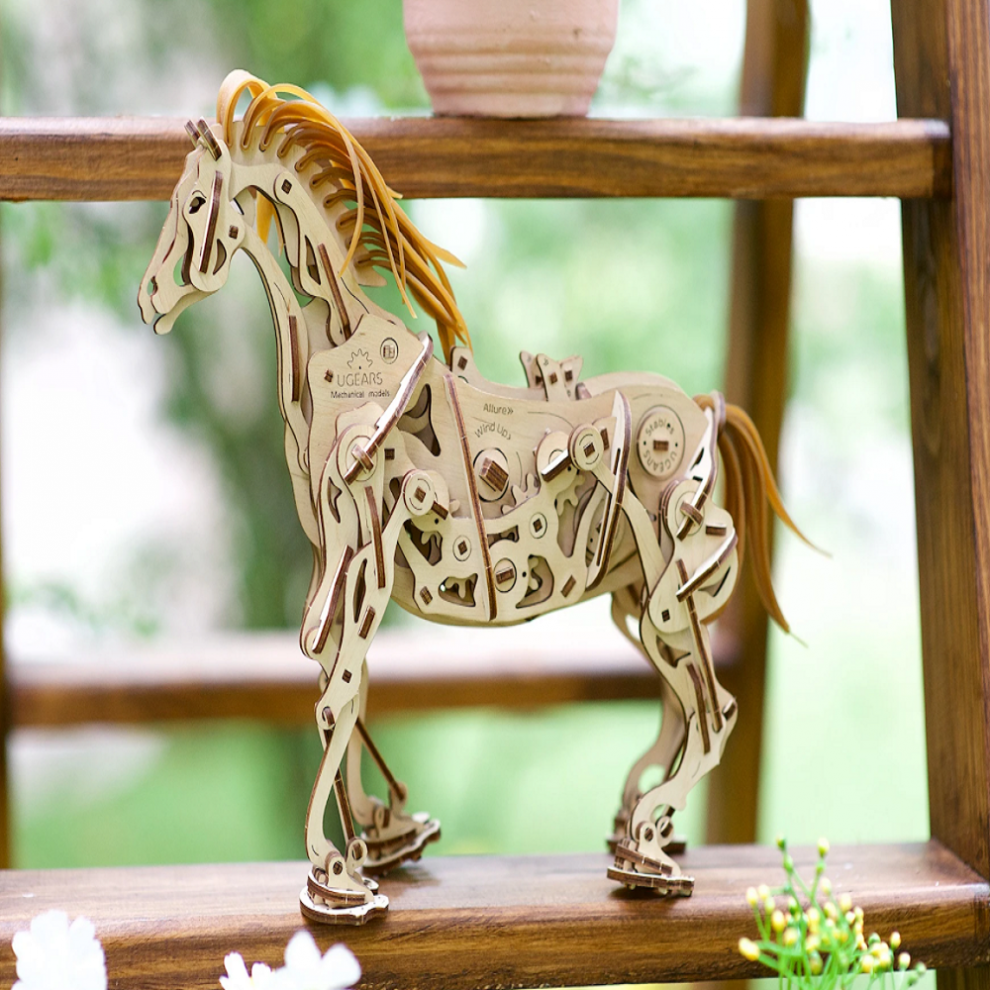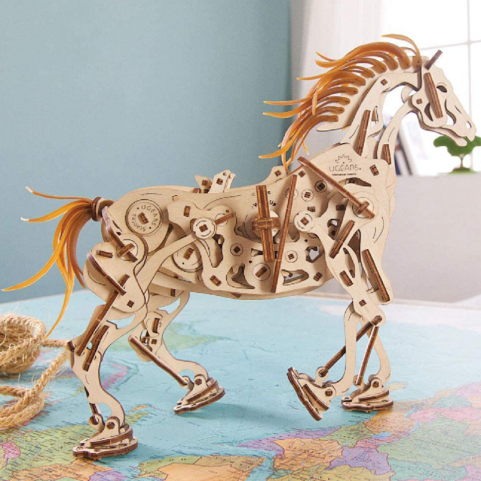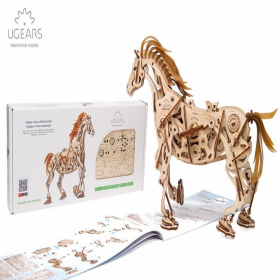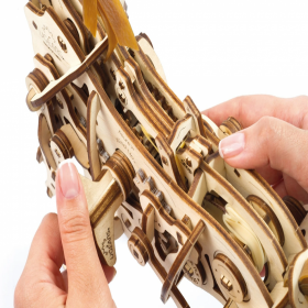 The UGears Horse-Mechanoid pays tribute to a majestic animal by creating a fully functional model. Featuring extra support and anatomical correctness to ensure stability on the move, this model's innovative mechanisms are all created with sustainable, high-grade wood. Laser-cut precision ensures joints and movements that are very close to that of a real horse, and the gears, cranks, and rubber bands of the model work with gravity to give it its power. In fact, this model is so functional that its head even sways when it moves. In the chest, you'll find an oscillating pendulum that works as the horse's bionic heart. This heart transmits the rubber band's energy to create the movement you'll love in this model. Of course, UGears' traditional design means you get to see everything working inside the horse while it's on the move.