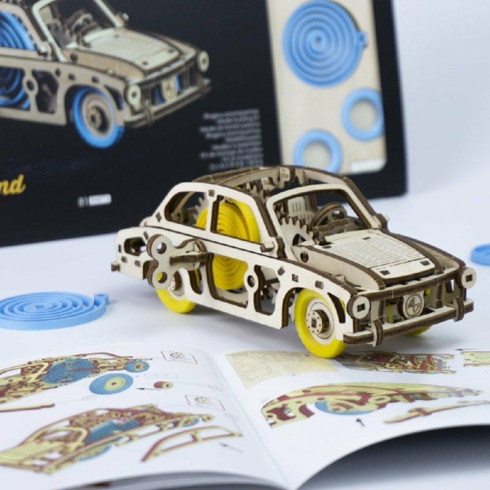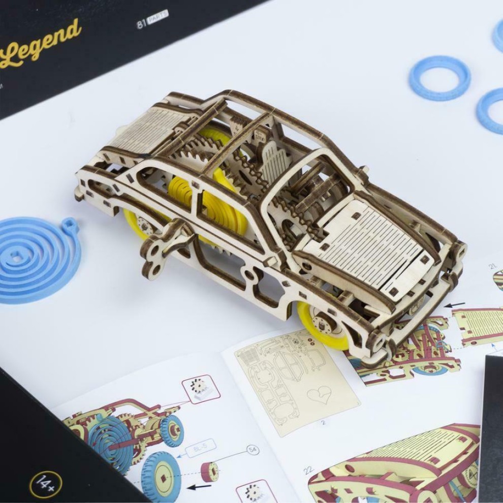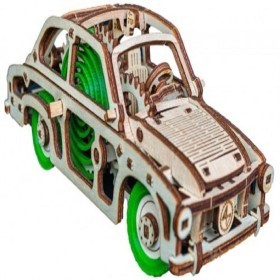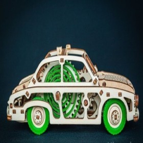 Polish Legend is a retro car which brings up nostalgic mood with its simple lines and curves. We combined light wood and bright plastic to create its smart and colorful image. While creating different designs we used rubber bands and even metal power springs to make the models move. But this time we had a less powerful but really beautiful spring. It is really easy to assemble and is also safe and suitable for any age. You can choose from 3 colours of the spring and wheels: yellow, green or blue! These bright accents inside the wooden model create its unique look. The clockwork is arranged in the body of the toy: the Polish Legend has its moving mechanism hidden under the hood.