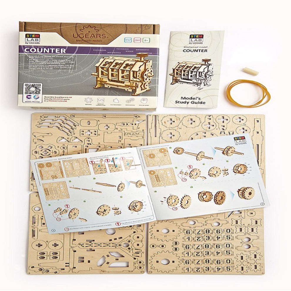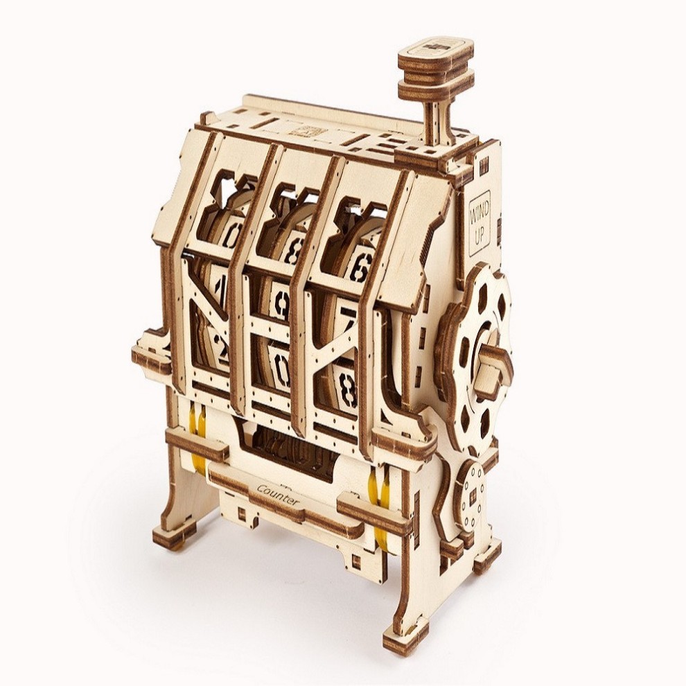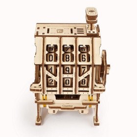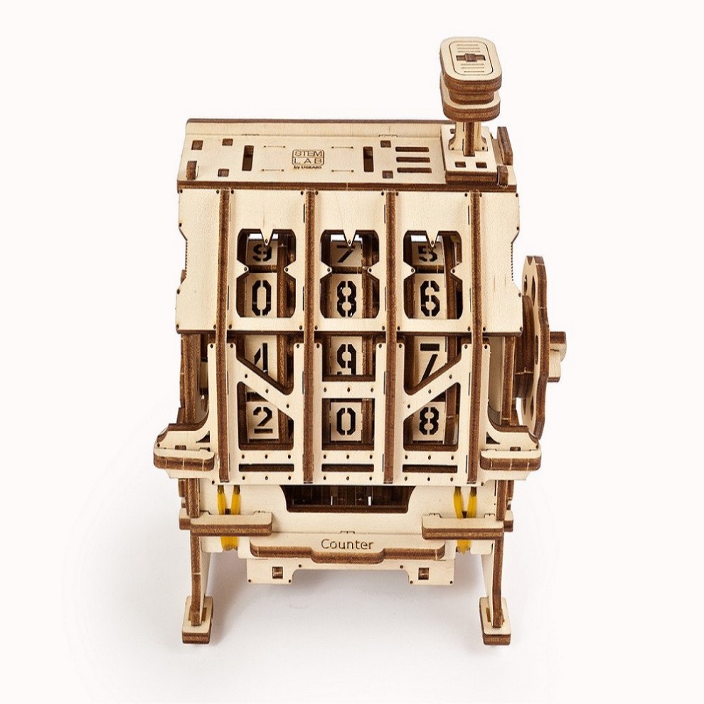 The Counter is a stylised educational model, an interactive study guide to the mechanism, only for learning its essentials and principles of working. It registers repetitive actions. It is an integral part of a device called an “Odometer”. The model has three cylinder gears with numbers from 0 to 9 and a Geneva Drive. This combination allows you to see an interesting mechanical feature