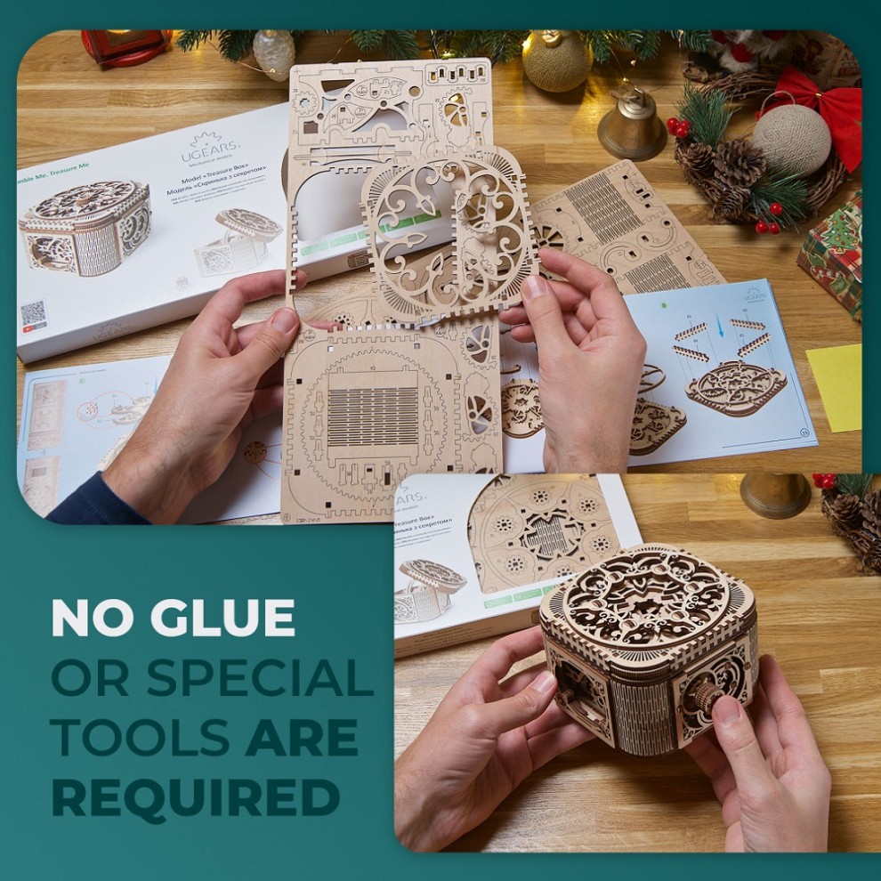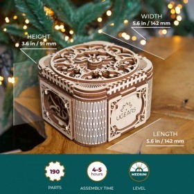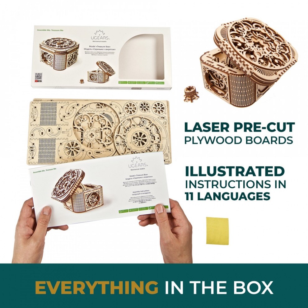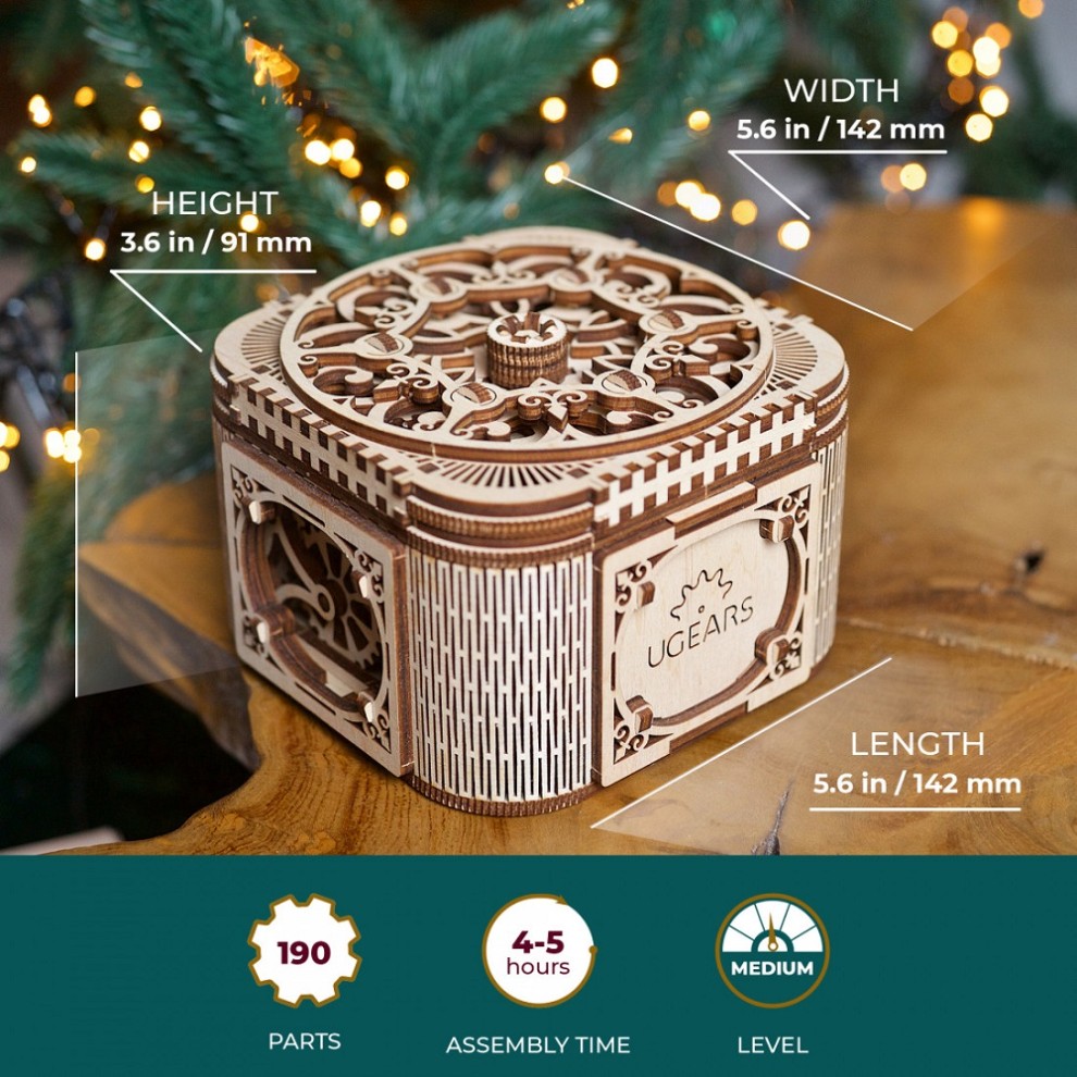 The true jewel of Ugears new collection of wooden models is an exquisite Mechanical Treasure Box for jewellery and notes. Mysterious and intriguing puzzle boxes, known in many cultures and especially popular in Victorian England, could not pass by our attention. Beautiful recognizable Ugears design and traditional step-by-step puzzle give you the Treasure Box – delight to the eye and food for brain.