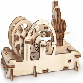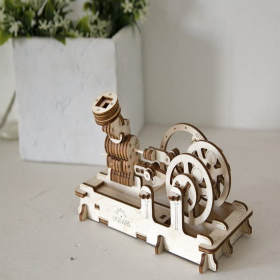 This wooden pneumatic mechanical toy is a small but fully functional example of a steam engine which uses air pressure to set its gears in motion. This model includes a built-in air pressure gauge and two compartments for storing spare parts or anything else you could think of. Watch the air pressure gauge respond to the force you create and see how it corresponds to the motion of the engine wheels and the crescendo of the hissing pneumatic drive.