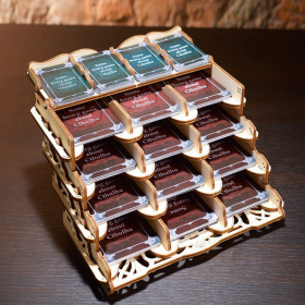 The ornate wooden exterior of the Card Holder hides an extending mechanism that slides out into ergonomic staircase shelves which allow you to conveniently grab a deck of cards from any compartment in your Card Holder. Extending the staircase also provides extra card slots at the top of the device in the lid for display or play. When closed, the stylish see-through design gives you a teasing view of the cards stored inside.